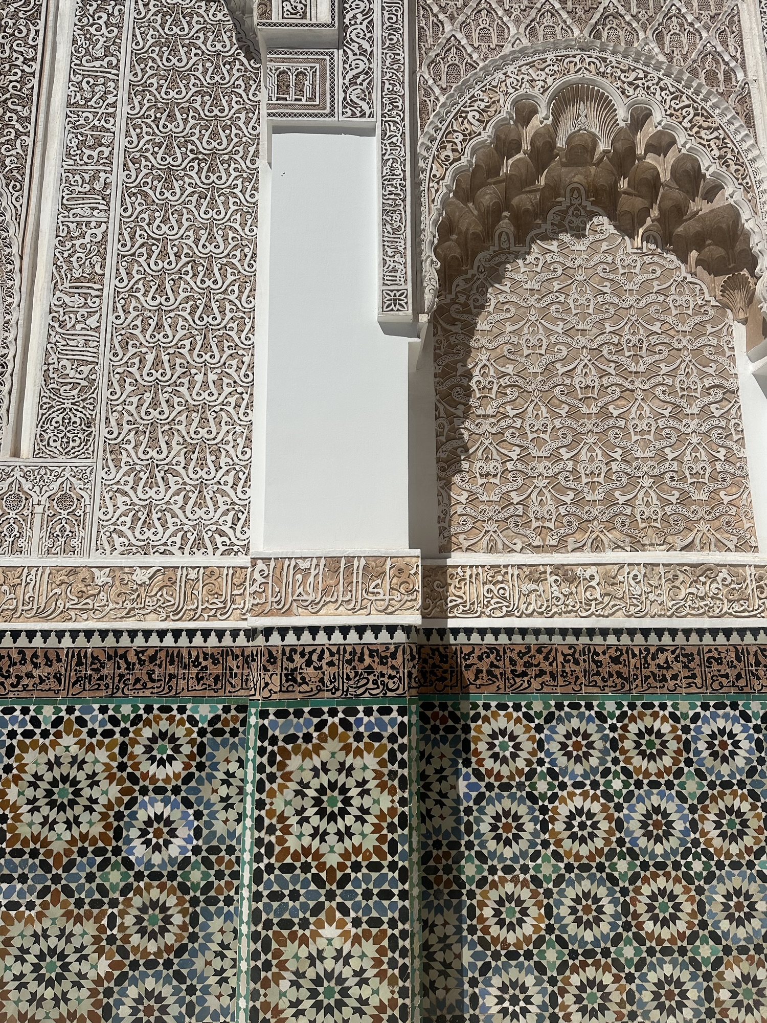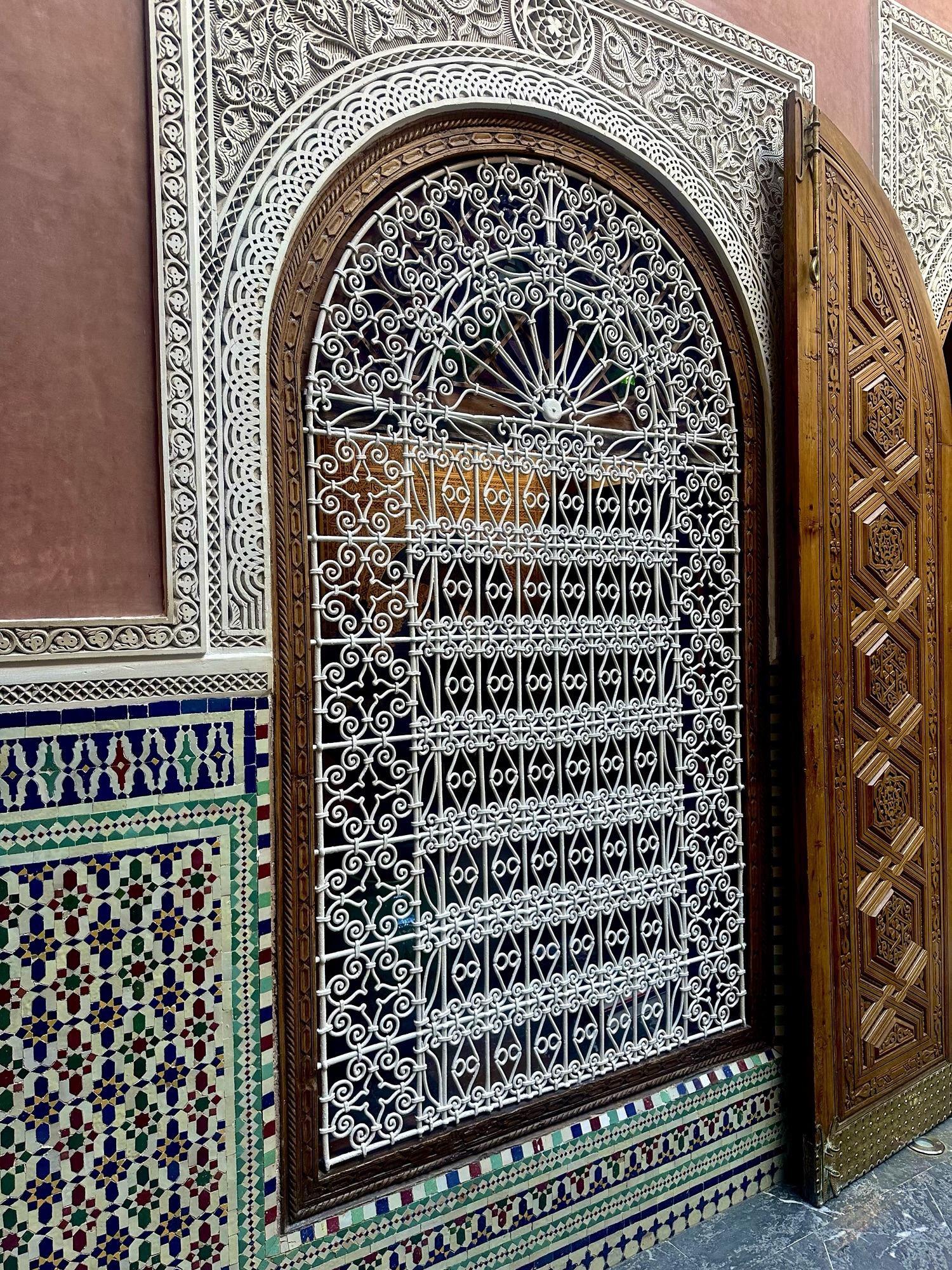 As you enter the madrasa, the first thing you’ll notice is the magnificent courtyard, a perfect example of classical Moroccan design with its symmetrical layout and calming water features. The zelij (mosaic tiles) that adorn the walls, floors, and fountains are simply mesmerizing, their patterns reflecting the deep symbolic meanings in Islamic art. The intricately carved woodwork on the ceilings and the stained glass windows filter the sunlight beautifully, creating an ethereal glow throughout the rooms.